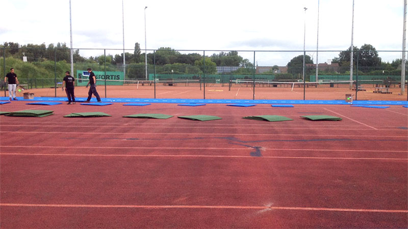 La pose des dalles thermoplastiques pour tennis est une opération assez simple et très rapide, qui demande environ 7 heures de travail avec une équipe de 3 à 4 personnes pour un court de 36x18m.